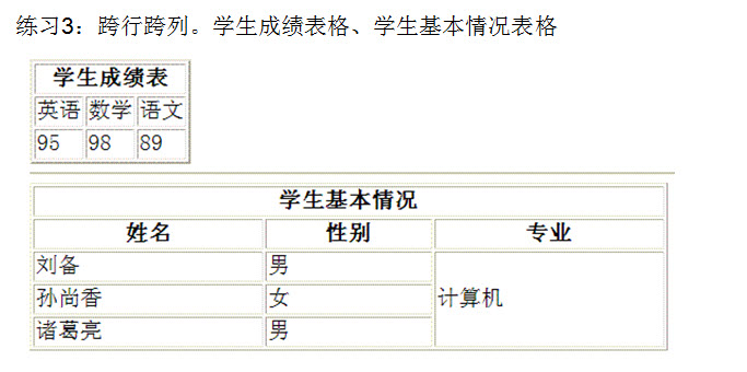 1 <html> 2 <head> 3 <title>表格练习3,4</title> 4 </head> 5 <body> 6 <table border="1"> 7 <tr> 8 <td colspan="3" align="center"><strong>学生成绩表</strong></td> 9 </tr> 10 <tr> 11 <td>英语</td> 12 <td>数学</td> 13 <td>语文</td> 14 </tr> 15 <tr> 16 <td>100</td> 17 <td>100</td> 18 <td>100</td> 19 </tr> 20 </table> 21 22 <table border="1" width="400"> 23 <tr> 24 <td colspan="3" align="center"><b>学生基本情况</b></td> 25 </tr> 26 <tr align="center"> 27 <td><b>姓名</b></td> 28 <td><b>性别</b></td> 29 <td><b>专业</b></td> 30 </tr> 31 <tr> 32 <td>刘备</td> 33 <td>男</td> 34 <td rowspan="3">计算机</td> 35 </tr> 36 <tr> 37 <td>孙尚香</td> 38 <td>女</td> 39 </tr> 40 <tr> 41 <td>诸葛亮</td> 42 <td>男</td> 43 </tr> 44 </table> 45 46 47 </body> 48 </html>