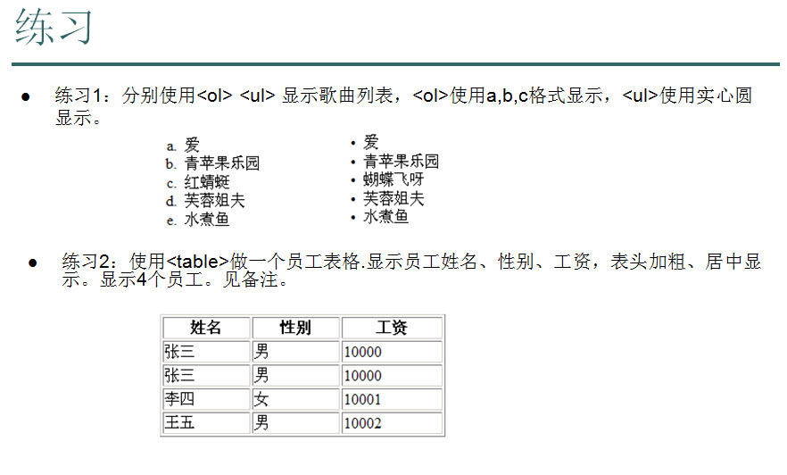 1 <html> 2 <head> 3 <title>表格练习1,2</title> 4 </head> 5 <body> 6 <ol type="a"> 7 <li>爱</li> 8 <li>水煮鱼</li> 9 </ol> 10 11 <ul type="disc"> 12 <li>爱</li> 13 <li>水煮鱼</li> 14 </ul> 15 16 <table border="1" width="300"> 17 <tr align="center"> 18 <td><b>姓名</b></td> 19 <td><b>性别</b></td> 20 <td><b>工资</b></td> 21 </tr> 22 <tr> 23 <td>张三</td> 24 <td>男</td> 25 <td>9000</td> 26 </tr> 27 <tr> 28 <td>张三</td> 29 <td>男</td> 30 <td>9000</td> 31 </tr> 32 <tr> 33 <td>张三</td> 34 <td>男</td> 35 <td>9000</td> 36 </tr> 37 <tr> 38 <td>张三</td> 39 <td>男</td> 40 <td>9000</td> 41 </tr> 42 43 </table> 44 45 </body> 46 </html>