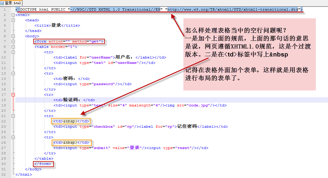 1 <!DOCTYPE html PUBLIC "-//W3C//DTD XHTML 1.0 Transitional//EN" "http://www.w3.org/TR/xhtml1/DTD/xhtml1-transitional.dtd"> 2 <html> 3 <head> 4 <title>登录</title> 5 </head> 6 <body> 7 <form action="" method="get"> 8 <table border="1"> 9 <tr> 10 <td><label for="userName">用户名:</label></td> 11 <td><input type="text" id="userName"/></td> 12 </tr> 13 <tr> 14 <td>密码:</td> 15 <td><input type="password"/></td> 16 </tr> 17 <tr> 18 <td>验证码:</td> 19 <td><input type="text" size="4" maxlength="4"/><img src="code.jpg"/></td> 20 </tr> 21 <tr> 22 <td> </td> 23 <td><input type="checkbox" id="rp"/><label for="rp">记住密码</label></td> 24 </tr> 25 <tr> 26 <td> </td> 27 <td><input type="submit" value="登录"/><input type="reset"/></td> 28 </tr> 29 </table> 30 </form> 31 </body> 32 </html>