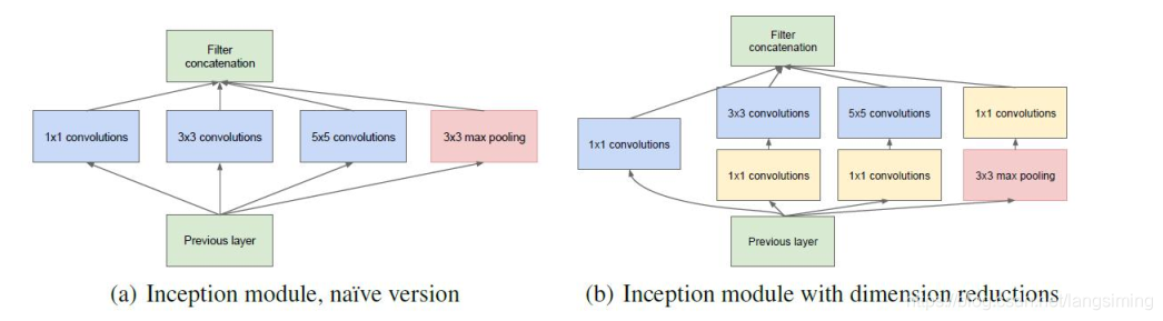 inception v1相对于之前的AlexNet来说,它将串行的结构改为了并行的结构,下面的图a是改进前的inception网络,b是改进后的inception网络。1*1卷积,3*3卷积,5*5卷积的过程是同时进行的,目的是同时抽取不同维度的图像特征。而图b的不同之处在于它在3*3,5*5的网络前面加入了1*1的卷积,乍看之下参数的个数增加了,但是由于通道数减少了,所以总的参数量还是变少了的。googleNet网络就是由9个这样的模块组成的。