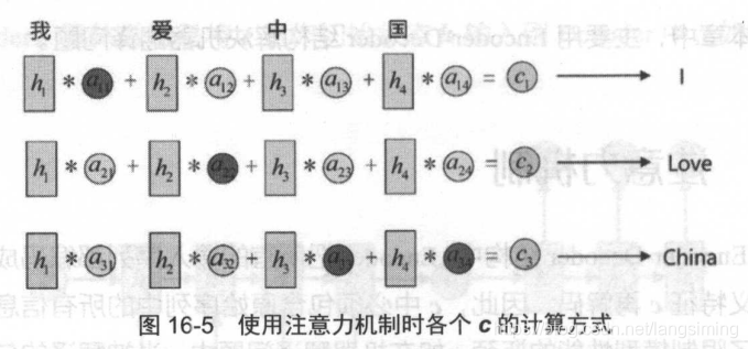 使用注意力机制后,每一个 c 会自动选取与当前所要输出的 y 最合适的上下文信息 。 具体来说,用 aij 衡量 Encoder 中第j 阶段的 hj和解码时第 i 阶段的相关性,最终 Decoder 中第 i 阶段输入的上下文信息 C来自于所高 hj 对aij 的加权之相 。以机器翻译为例(将中文翻译成英文),每一个c的具体计算方法如图。