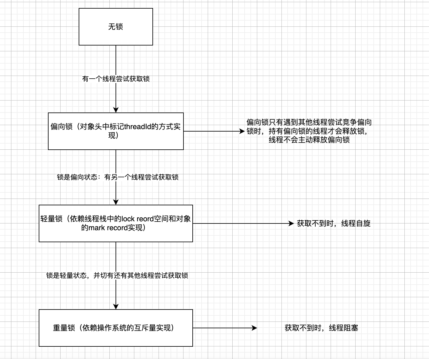 我们知道,锁是有自旋特性的,获取不到锁的线程会不断尝试若干次去获取锁资源,那如果依然获取不到,才会将线程挂起。这是为了减少上下文切换带来的性能损耗。 但是如果,我们提前知道某个资源竞争非常激烈,现在去获取它肯定是抢不到的,是不是可以减少自旋带来的cpu消耗呢。这就是我理解为什么要将锁的状态分成偏向,轻量,重量的原因。如果无锁,线程可以直接获取到锁资源,并升级为轻量锁;如果是轻量锁,甚至节省不再需要通过多次cas的方式去设置threadID修改偏向锁状态,只需检测是否有指向该线程的偏向锁就可以;如果是偏向锁,其实表明已经有线程持有该锁了,但是没有其它的竞争者了,我再尝试几次获取锁,有可能可以拿到;那如果是重量锁,就表明锁的竞争比较激烈,可以先挂起线程,不用浪费cpu资源去自旋了。
