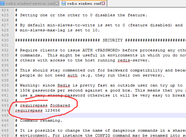都打开找到requirepass,加一行:requirepass 123456,123456是密码,保存重新运行redis,访问redis就需要密码了。