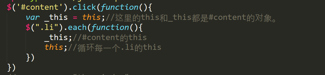 这种情况下,我们希望在每一次循环后都能得到$("#content")的this,但是因为this是只在当前函数内部使用的,又因为js函数是可以多层嵌套的原因,使得我们无法得到最开始的this,这时我们可以把他先用一个变量存储起来,最终达到我们想要的目的。(一般我们会这样定义:var _this = this var that=this)。个人习惯是用后者。