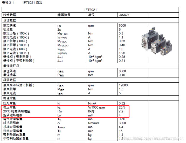 以西门子1FT6电机为例,从数据手册可以查询到定子电阻、电感和永磁磁链等相关数据: