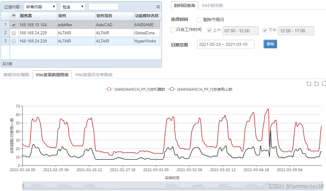 图2是客户使用LMT LicManager软件的真实案例效果图。从实际测试中可以发现很多用户打开软件,其实并没有使用,导致许可闲置浪费,而对这种情况无论是IT还是软件的管理人员都无能为力,必须通过技术的手段,识别软件客户端闲置的情况,然后将其浪费的许可回收,供给真正需要的人使用。某客户使用SolidWorks Vlic后,20个SolidWorks许可支持约70个用户的需求,效率提升了超过300%。