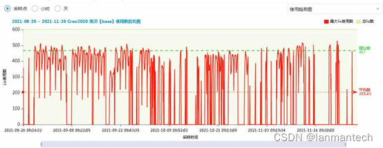 LMT多年致力于企业设计软件许可证的研究,研发了一款集许可证监控、使用评估和效率优化的软件——LMT LicManager。首先通过对SolidWorks软件的使用监控,评估出真实需求,让软件管理者对SolidWorks整体的使用情况有很明确的认知,下图是使用趋势和需求数量图: