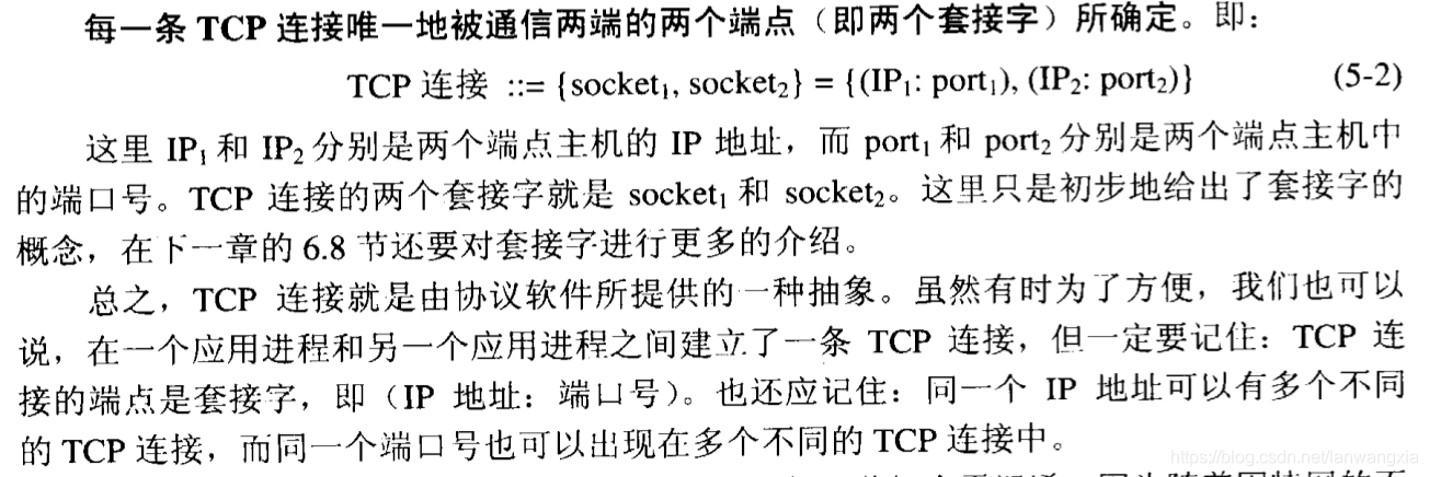 上边讲过,每一条tcp连接有两个断点。那么,tcp连接的断点是什么呢?不是主机,不是主机的ipd地址,不是应用进程,也不是传输层的协议端口。tcp连接的端点叫做套接字(socket)或插口。