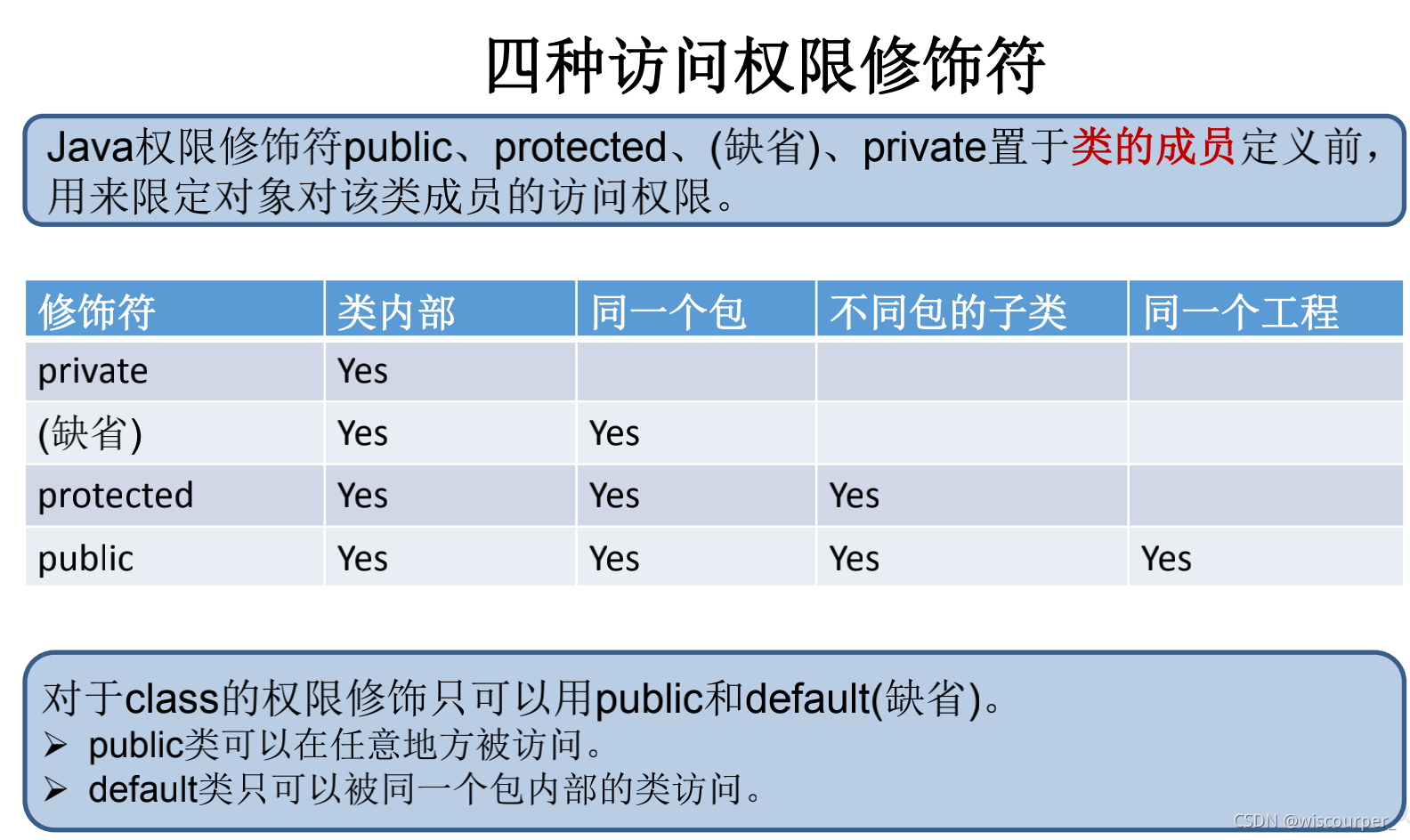 只有三种权限修饰符public、protected、private,缺省是默认为public;只能修饰类内部结构,不能修饰类