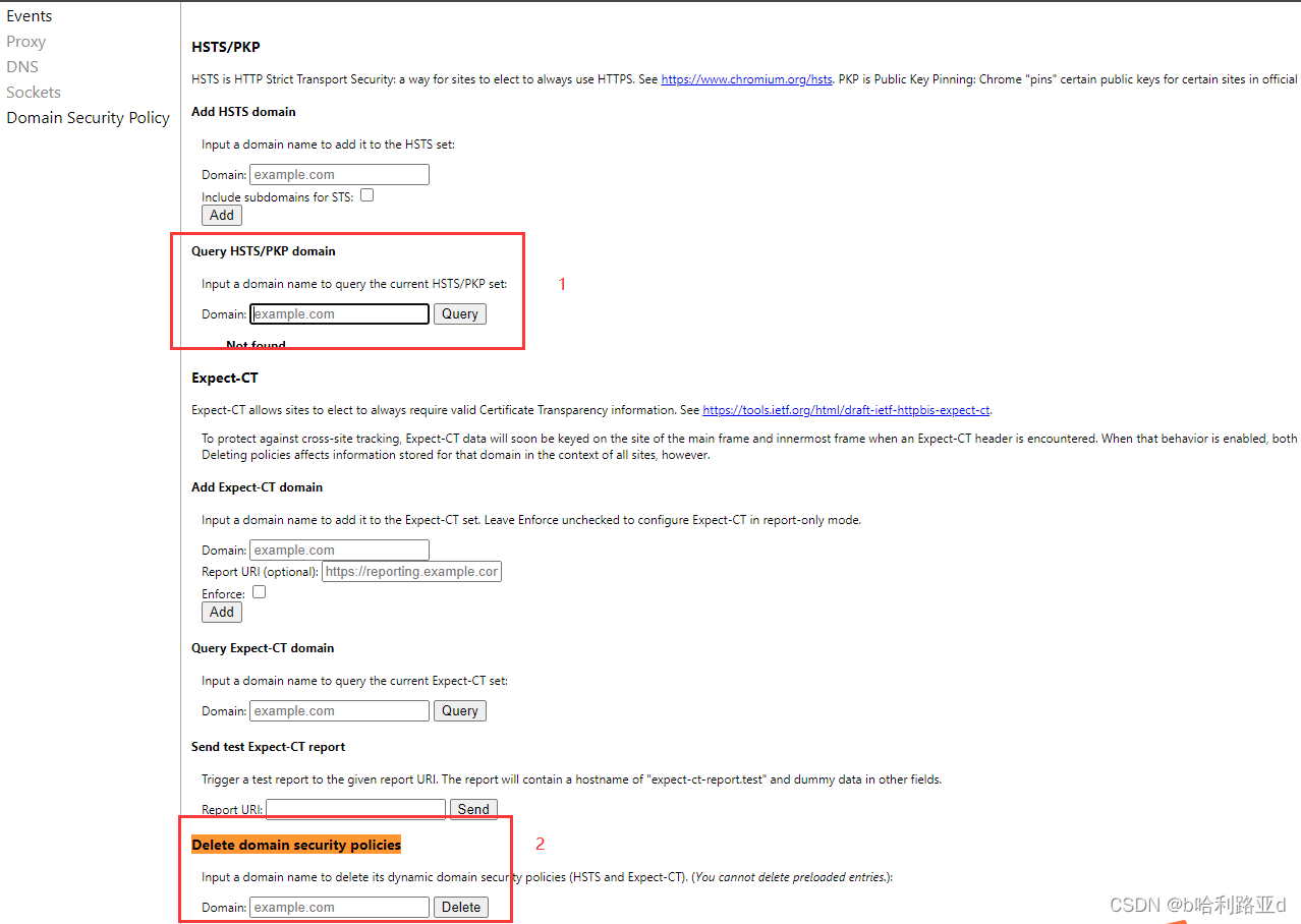 在浏览器地址栏输入:chrome://net-internals/#hsts
