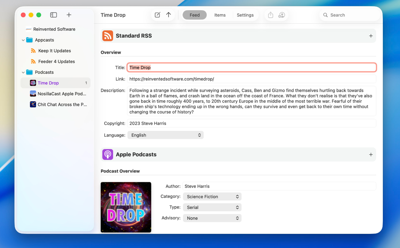 Feeder 内置 Sparkle 模板,自动读取 dmg 版本号、生成 DSA 签名、输出 Appcast。