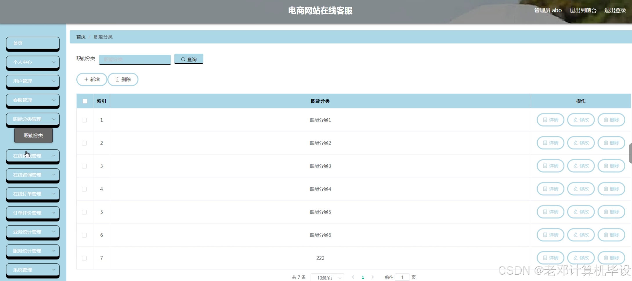 项目功能:用户,职能分类,客服,在线客服,在线咨询,在线订单,订单评价,业务统计,服务统计