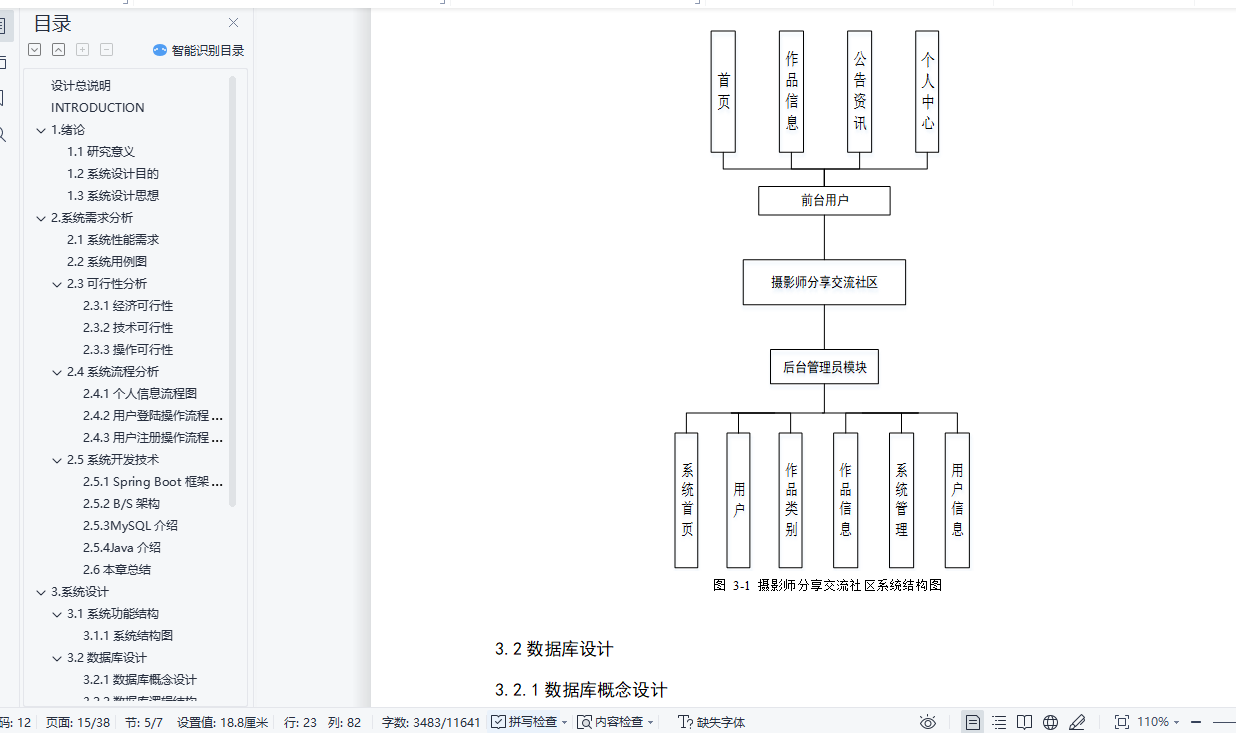 系统需求分析旨在确定摄影师社区平台系统的功能和性能需求,以满足用户的核心需求。系统需要具备用户注册与登录功能,确保用户可以安全地访问平台。其次系统应提供作品上传和展示功能,让摄影师能够方便地展示自己的作品并与其他用户分享。另外,系统还需要具备技术交流与讨论的功能,以便摄影师们可以就摄影技术、创作经验等进行交流与分享。此外为了增加平台的趣味性和互动性,系统还应包括社区活动组织等功能。最后,通过对这些需求的分析,可以为后续的系统设计和开发提供指导和基础[5]。