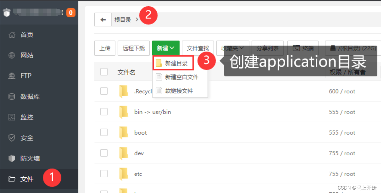 通过宝塔面板选择【文件】–》【切换到根目录】–》【新建–新建目录】
