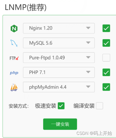 - 首次登录宝塔,安装推荐软件,版本选择如图所示,点击【一键安装】后,等待安装完毕