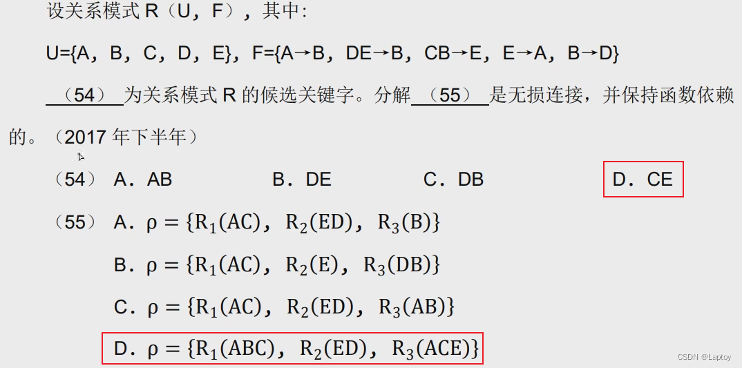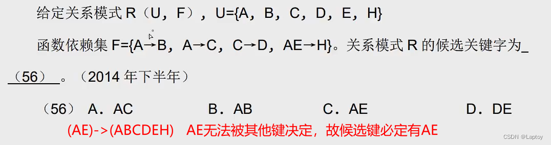 - 确定候选关键字:根据给定的函数依赖集,判断每个选项的候选关键字。