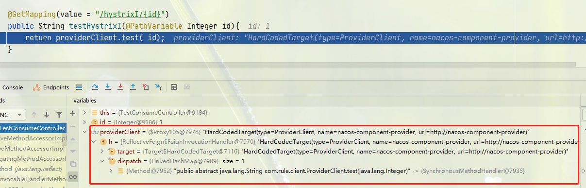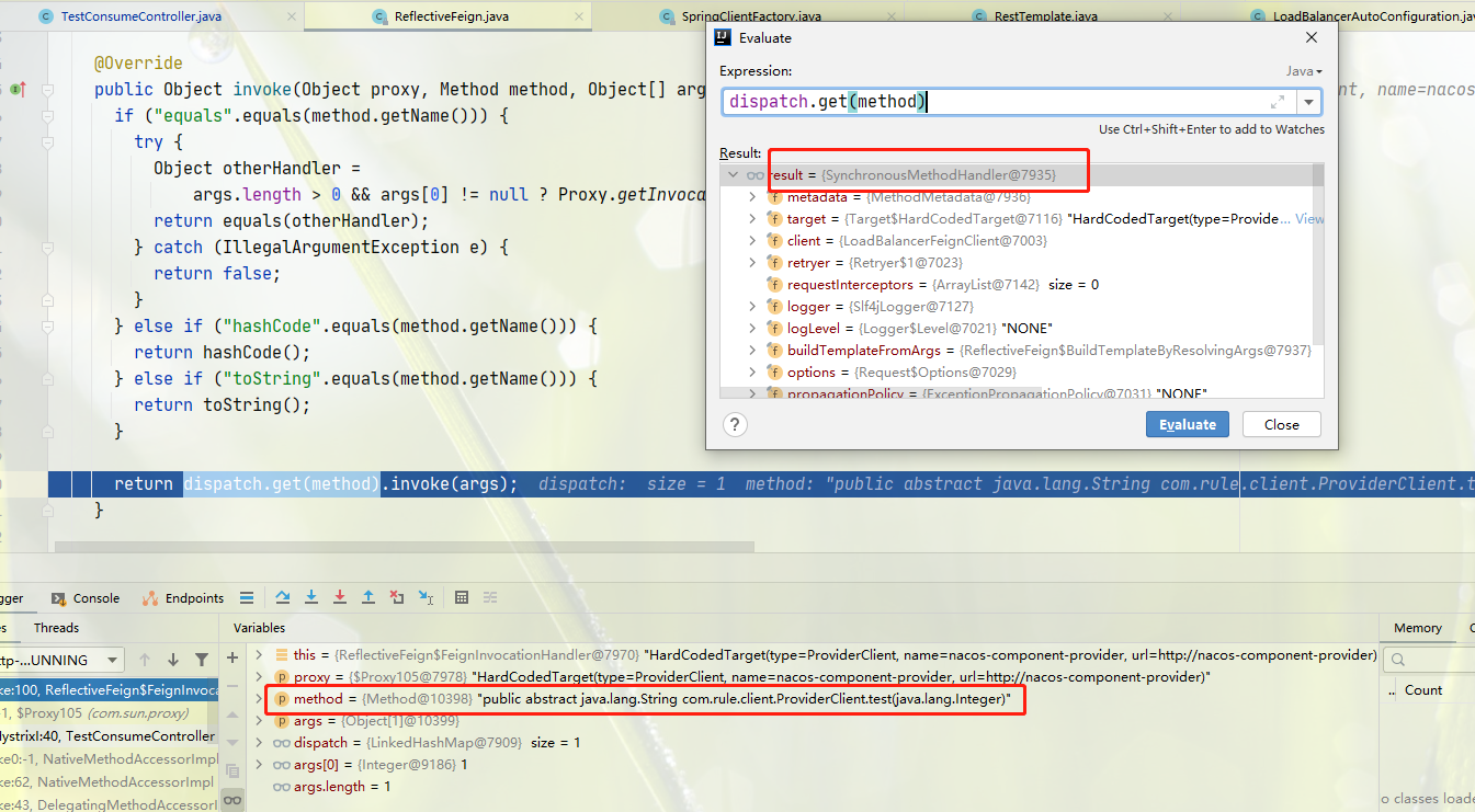 当调用 ProviderClient#test 方法时,观察注入的 ProviderClient,就是我们上一步生成好的代理对象,然后调用 ReflectiveFeign#invoke() 实现对方法的调用。