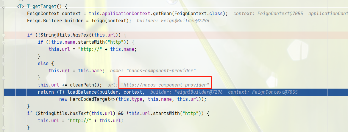 使用 FeignContext 构造 Feign.Builder构造器,看名字可以知道就是生成 feiclient 的构造器,将需要的参数进行封装,此时的 ProviderClient 接口的调用url的前缀为: