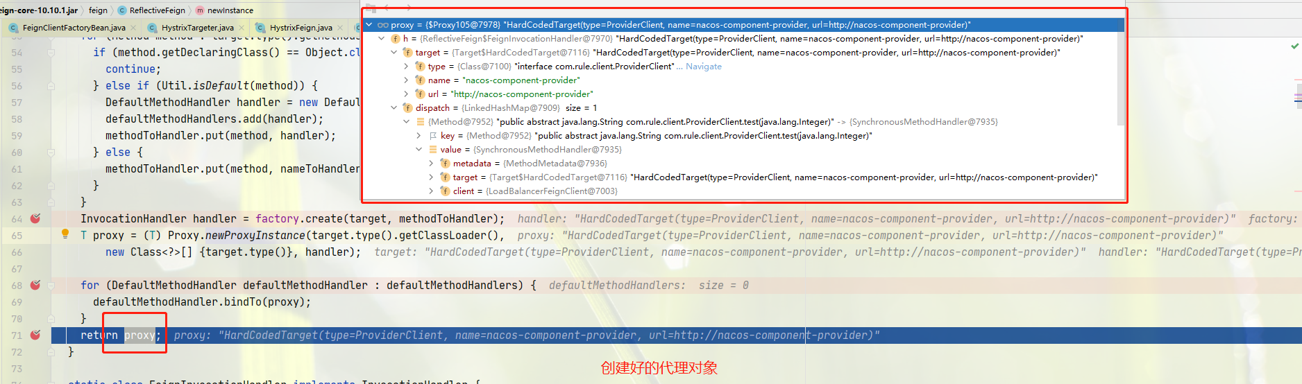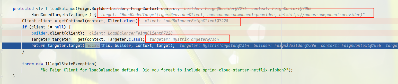 调用 loadBalance() 方法,构造了 HystrixTargeter 对象,然后调用 HystrixTargeter#target 方法,发现这里调用了 Feign#target, 这里就是通过反射将之前的 Feign.Builder 创建出来代理对象,但是还有 ProviderClient 中的方法的 springmvc 的 @RequestMapping 等注解没有解析。
