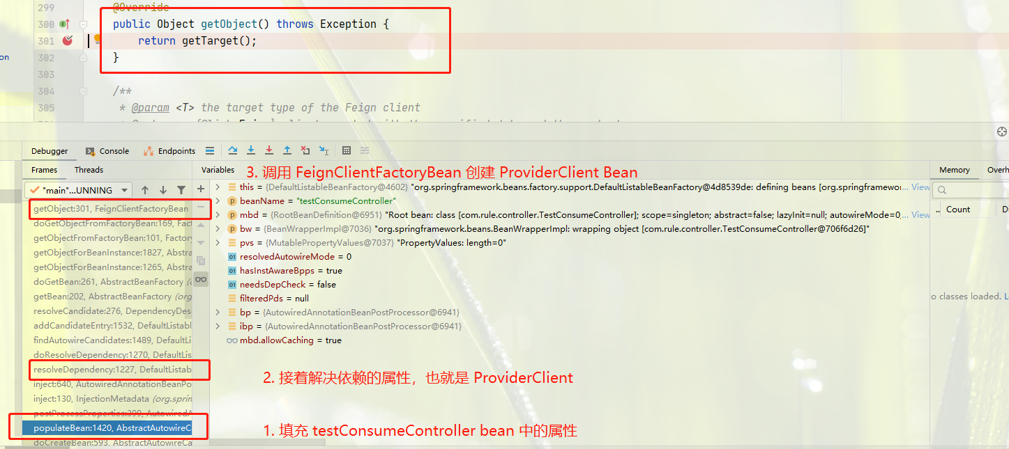 看到这里发现只是简单的将 beanDefinition 信息注册进 beanMap,但是还没有真正实例化,那么到底是在哪里实例化的呢?由于这个 bean 是 FeignClientFactoryBean,那么肯定是这个 bean 工厂进行创建的,进入这个类。发现一个重载的 getObject 方法,很明显这个是创建 bean 的方法,肯定是有人依赖 FeignClientBean 也就是我们这里的 ProviderClient,当被自动注入时,就会去获取getBean(ProviderClient.class) 方法,接着就会调用 bean 工厂去创建 bean。下图就是 IOC 的实际运行情况。