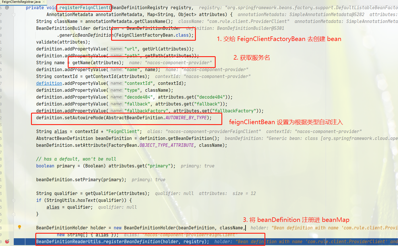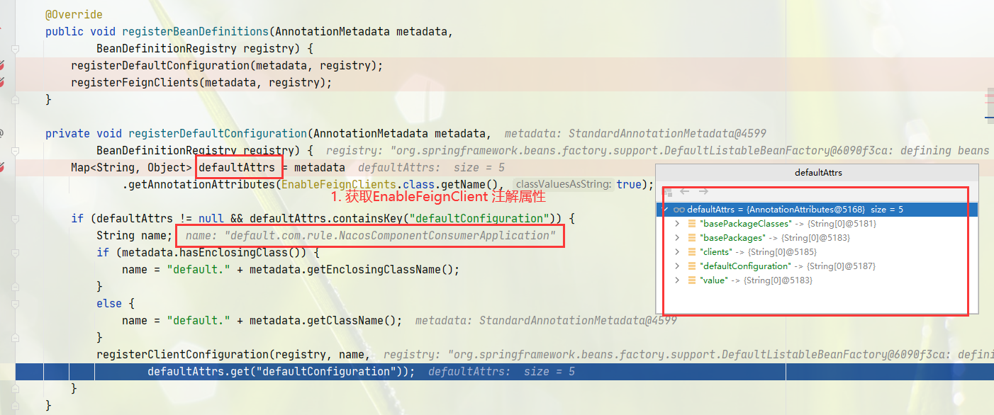 registerBeanDefinitions,这里是使用了 @EnableFeignClients,那么这里是注册的核心逻辑
