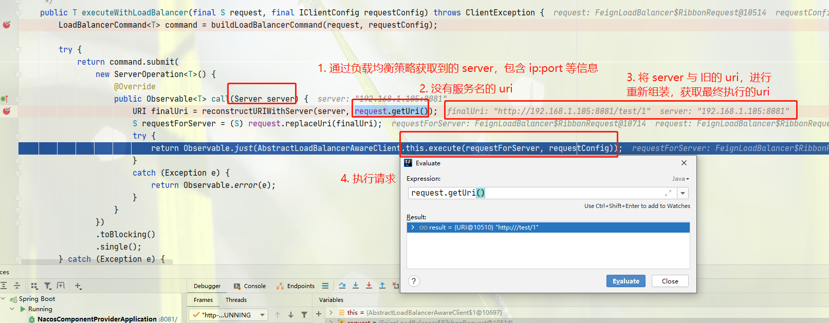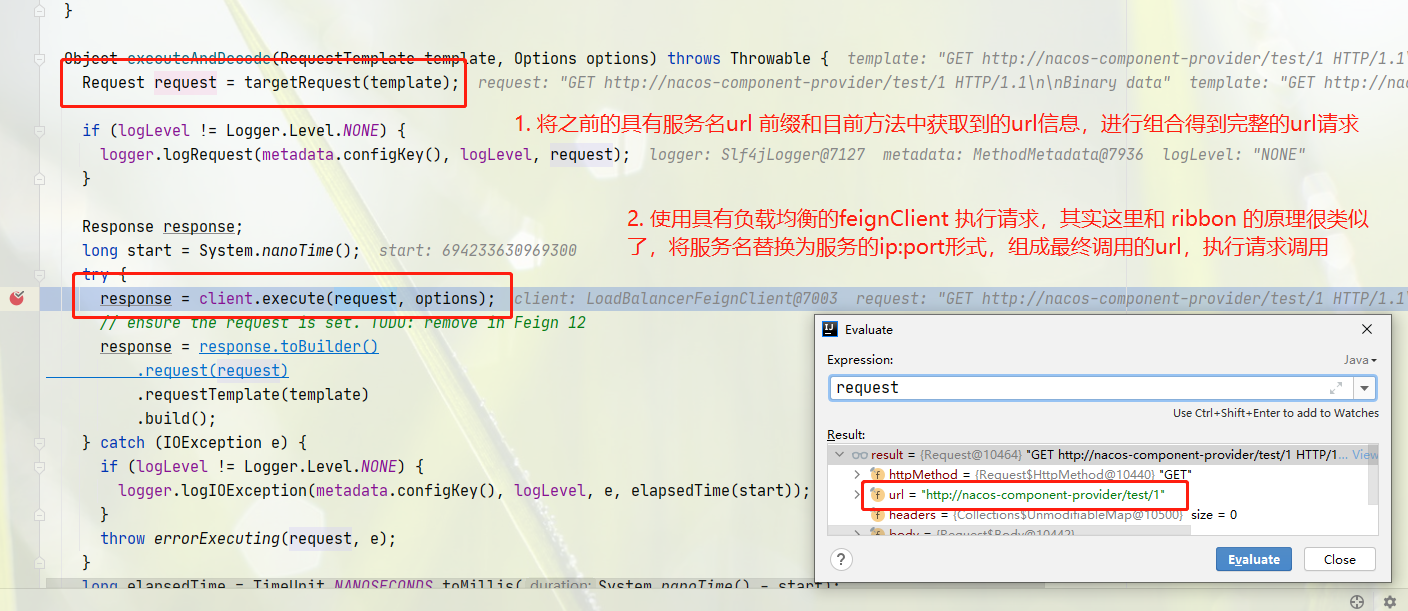 - 通过 @FeignClient 在注解中的name,确定服务名,然后 RibbonClient 使用服务名去获取负载均衡器 loadBalancer,再通过负载均衡算法获取到 ip:port, 然后构建的请求为 http://nacos-component-provider/test/{id},当 id = 1时,最后通过参数封装等,请求为http://nacos-component-provider/test/1,然后进行服务名替换,http://ip:port/test/1。这个就是最终的请求,也是 @FeignClient 注解的作用。