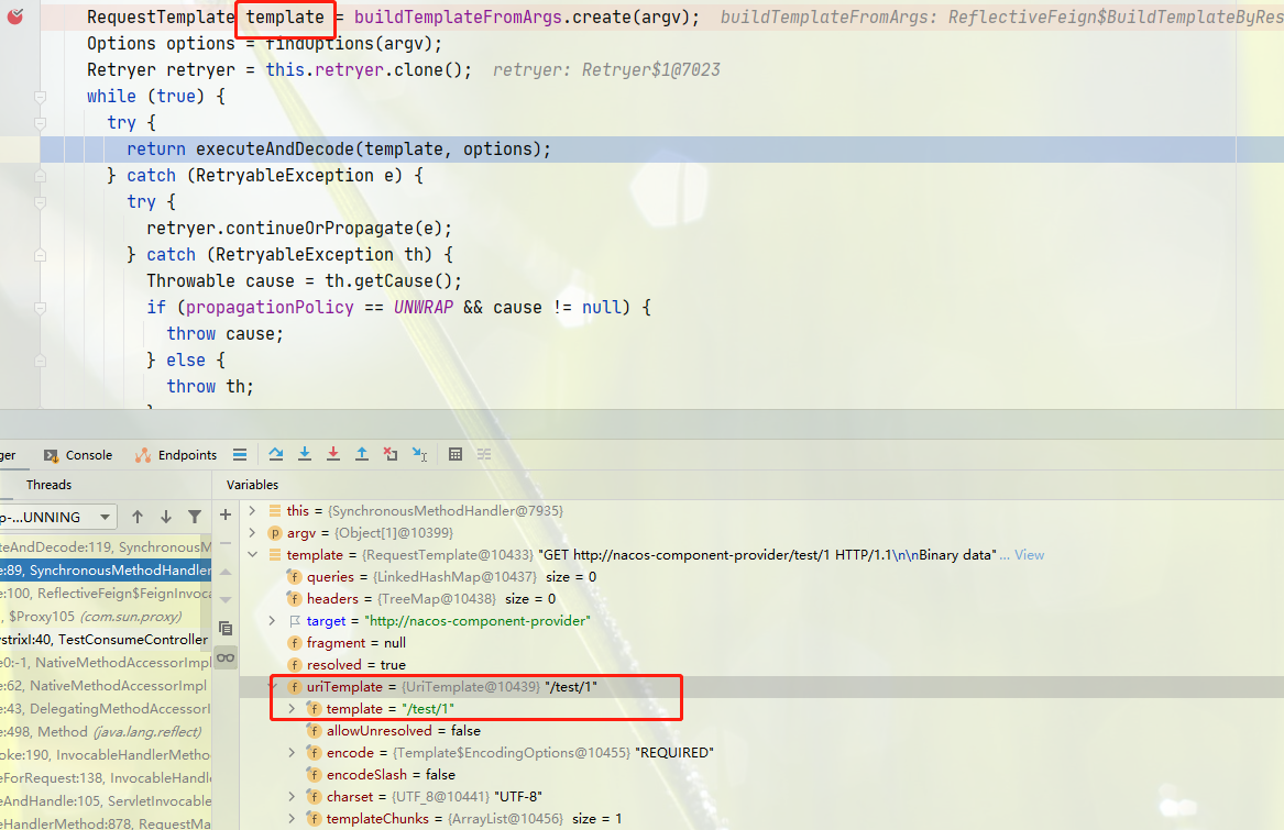 根据调用的方法,使用 dispatch 调用对应的 methodHandler,dispatch 就是之前构造代理对象中的方法映射 map,然后调用 SynchronousMethodHandler#invoke() 方法,根据方法上的注解信息 value=“test/{id}”、参数id=1,创建 RequestTemplate 对象,其中 URI=test/1。