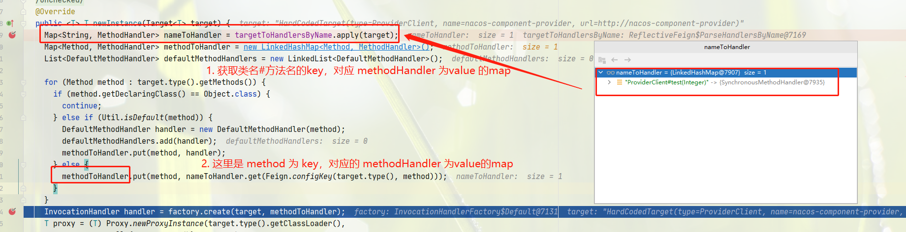 首先通过反射获取 ProviderClient 类中的所有方法,构建为 ProviderClient#test() 为key,value为对应的 methodHandler 形式的 map,其中 methodHandler 具有一个负载均衡客户端 LoadBalancerFeignClient ,用于后面使用 LoadBalancerFeignClient 调用方法,这里是为了后面获取 method上注解的属性,例如 url,httpMethod 等属性准备。