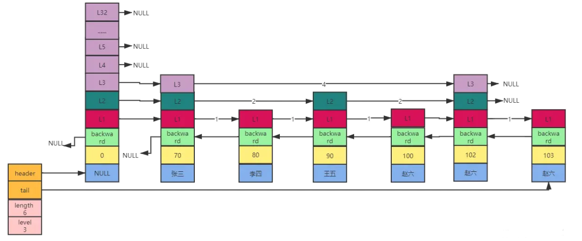 - 从表头的level即3开始,首先到张三的L3,发现分数70,比目标分数101小跳过,根据其前指针找到赵六的L3,发现分数102,比目标分数101大,将赵六L3记录在待更新数组update中,同时记录跨度span为4。接着到下一层,张三的L2层,发现分数70比目标分数101小跳过,根据前指针找到王五的L2,发现分数90,比目标分数101小跳过,根据前指针找到赵六的L2,发现分数102比目标分数101大,将赵六的L2记录到待更新数组update中,同时记录跨度span为2。最后到下一层,张三的L1层,逻辑和刚才一样的,也是记录赵六的L1层和跨度span为1。