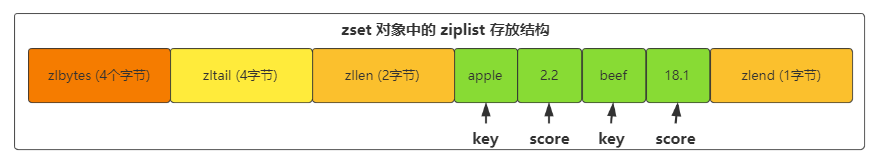 当使用 ziplist 存储时,类似上面使用 ziplist 存储 hash 对象的结构,根据分值从小到大排序,分值较小的元素放置为靠近表头的位置,分值较大的则靠经表尾的位置。而元素的成员和分值存储,则是第一个节点为成员,第二个为分值,结构如下。