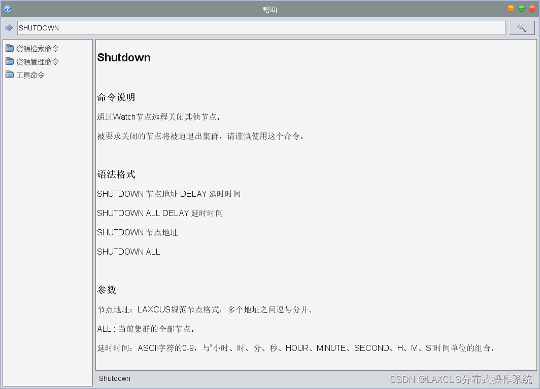 LAXCUS分布式操作系统对SHUTDOWN命令的解释如下图所示。