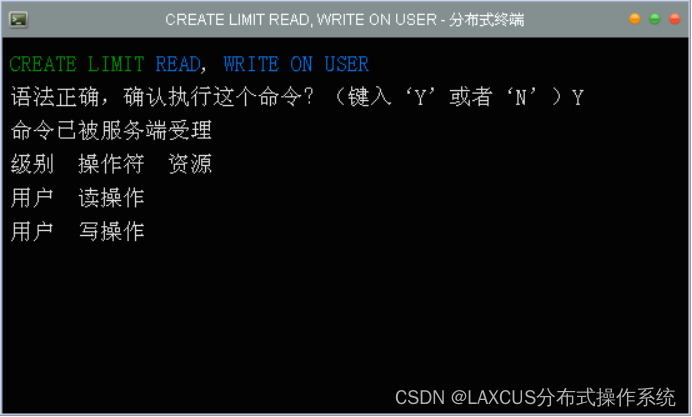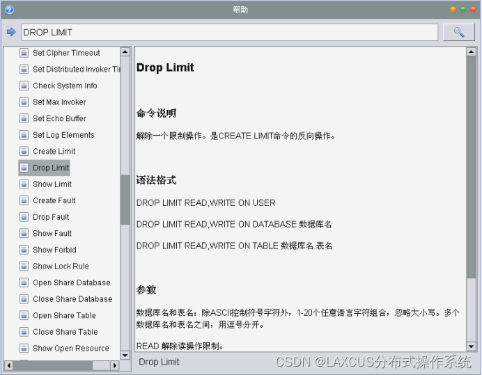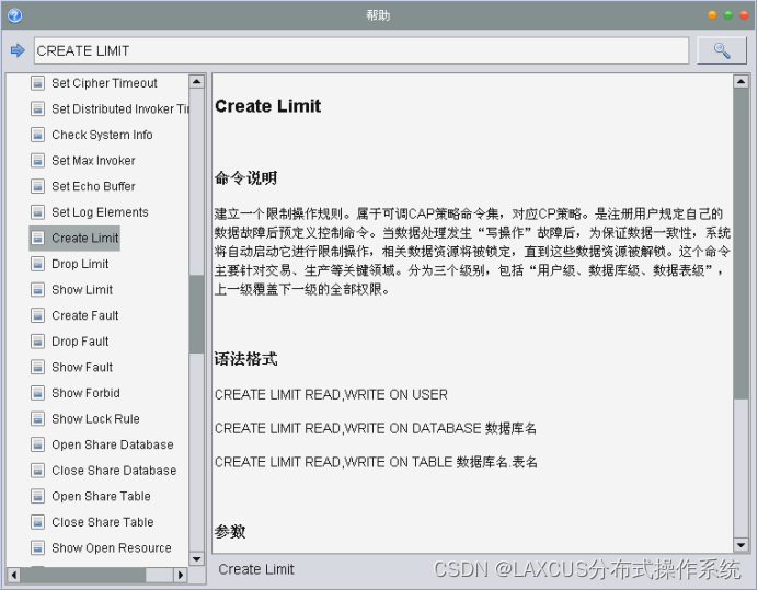 在Laxcus分布式操作系统里,将处理业务切换到CP状态使用Create Limit 命令。见下图,这个命令有三种处理模型:用户、数据库、数据表。如果用户使用Create Limit命令执行用户模式处理且被系统接受后,那么表示除数据处理工作之外,用户的其它业务,都执行CP策略(一致性处理)。