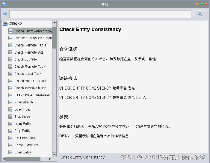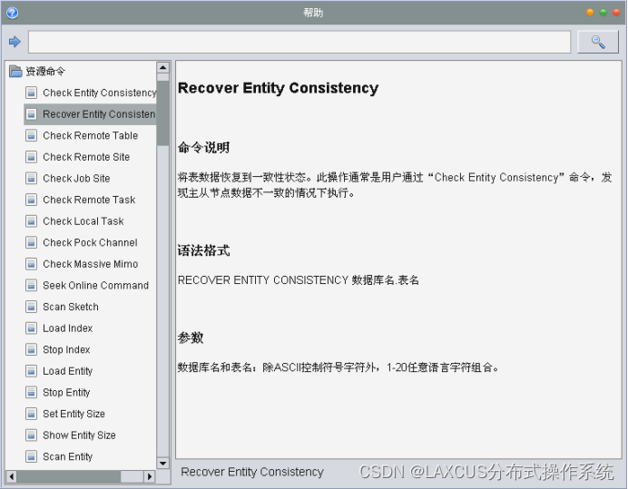 但是特殊情况总是存在,为此,Laxcus分布式操作系统也为用户提供了多种可能选择。比如我们为了满足高并发需要,有时会将数据库或者数据表切换到AP状态,然后出现数据不一致性现象,这时为了将计算机集群的分布数据恢复到一致状态,我们可以使用“”命令来完成。这个命令将扫描计算机集群上的所有相关数据,将数据调整到一致状态。扫描和重组数据过程中,相关的资源会被系统锁定,直到完成后才解锁,所以处理过程中不会出现“多写”现象,也就是杜绝了不一致的现象发生。