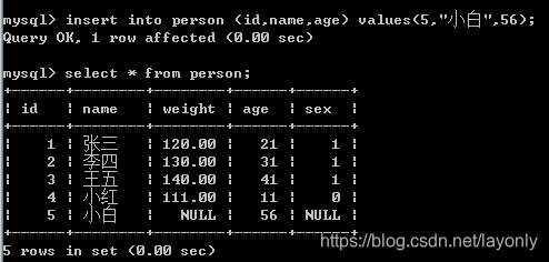insert into person (id,name,age) values(5,"小白",56);