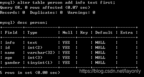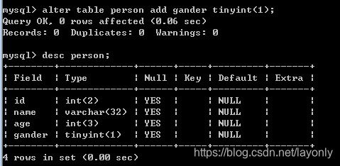 alter(修改) table(表) person(哪个表) add(添加) gender(性别) tinyint(数据类型);