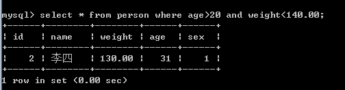 语法格式:select * from where 条件1 and 条件2 两个条件都必须符合才能查询出来