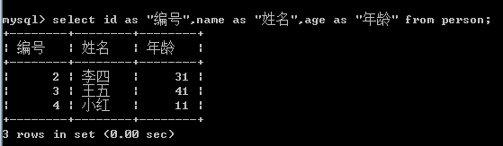 select id as "编号",name as "姓名",age as "年龄" from person;