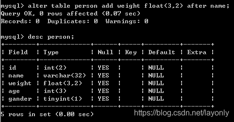 插入其他的需要用到after关键字,假如将一个float类型的字段weight加入到name之后