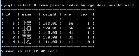 先按照年龄进行降序排序,如果年龄相等的话,再按照体重进行升序排序