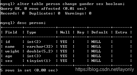 alter table person change gander sex boolean;