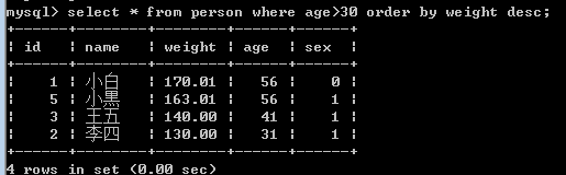 找出年龄大于30岁的,并且按照体重进行降序进行排列(注意先查找再排序)
