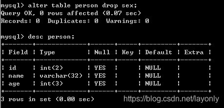 见名知意 alter(修改) table(表) person(哪个表) dorp(删除) info(字段);