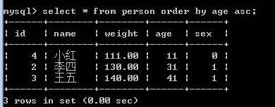 语法格式:select * from 表名 order by 字段 asc;升序