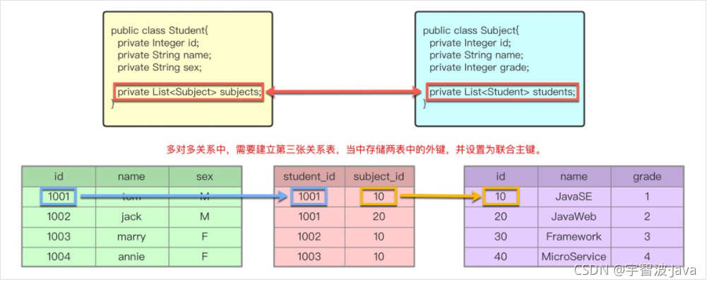 ManyToMany:多对多关系(Student --- Subject):一个学生学习多门课程,一个课程被多个学生学习