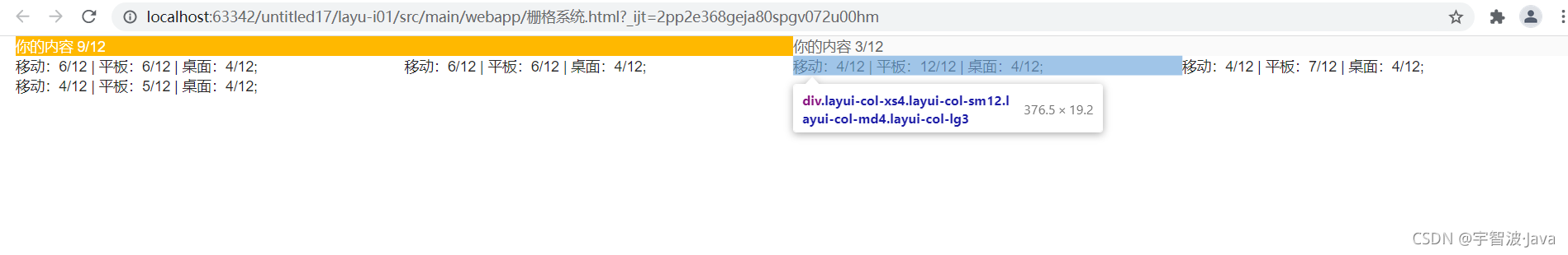 可以看到,当在电脑页面上显示的时候,栅格布局第一行分为了四个模块,大家也可以将页面放大,当放大到平板的尺寸的时候,