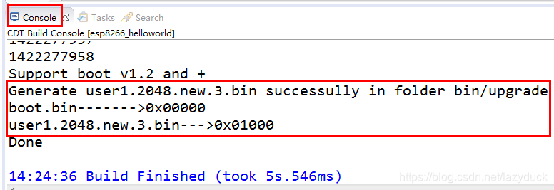 程序是直接就能用的,咱们编译看一下。鼠标右键点击左侧工程栏里的esp8266_helloworld,在弹出的页面先点击:Clean Project,执行完成之后,再点击Build Project。编译完成之后,下方的输出框会有类似信息输出: