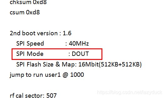 注意:SPI MODE这里,它表示的其实是ESP8266芯片和flash芯片的连接方式,一般以DOUT和QIO居多。如果你不确定,建议你的模块买回来之后,先不要烧程序,先上电看一下串口打印的信息,里面有说明。如下所示: