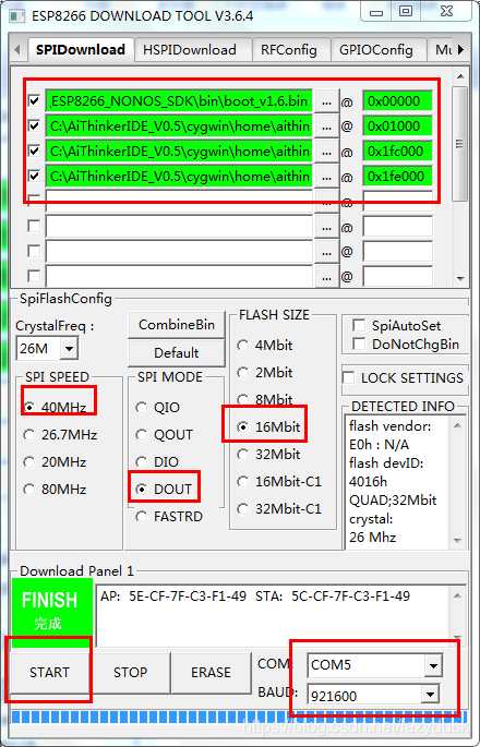 我们对下载软件进行配置,SPI SPEED,SPI MODE,这两个位置参照截图里的配置,SPI FLASH一定要根据你手里的模块选择。每个bin文件的下载地址一定要写对,否则程序无法正常运行。