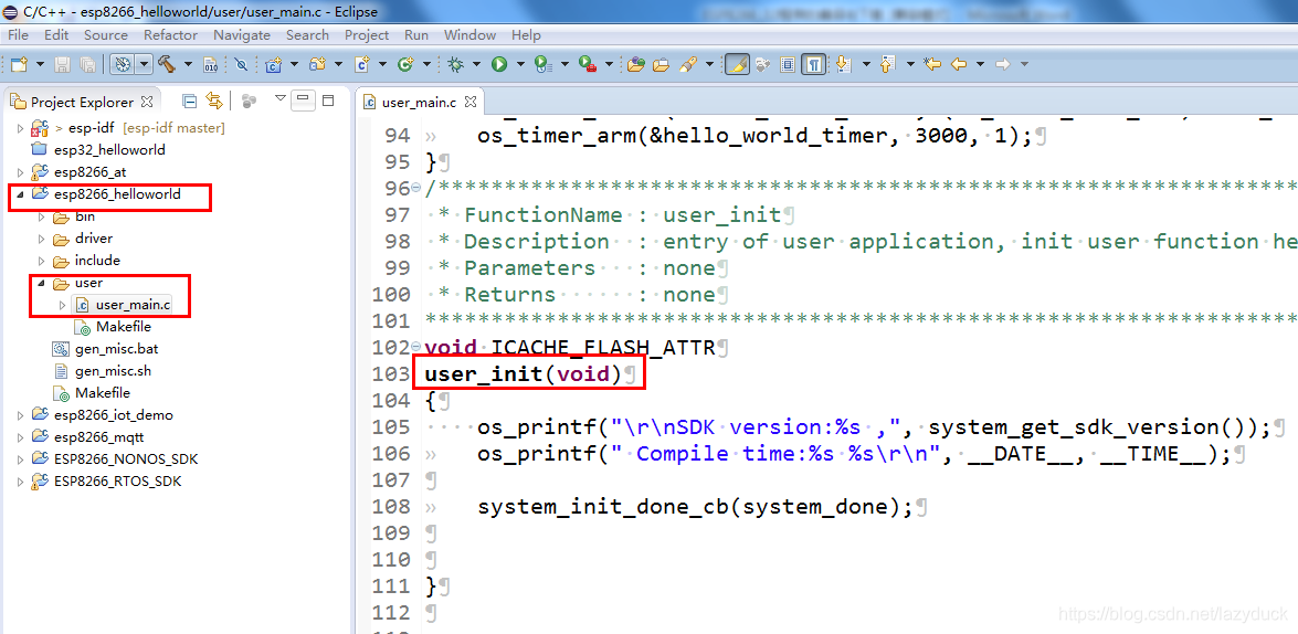 工程选择:esp8266_helloworld,依次打开包含的文件夹:user,以及user下面的user_main.c文件。