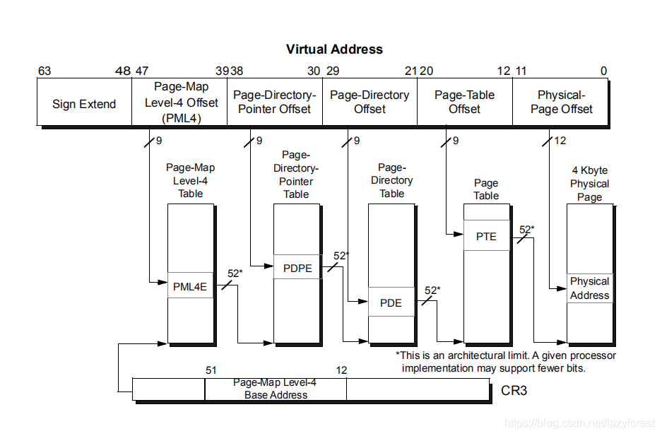初学调试技术,记录一下X64位模式下4-kbyte虚拟地址转换到物理地址的验证流程,该模式下虚拟地址包含了4个表的索引以及一个地址偏移,其中的47到0这个48个位分段对应了PML4E,PDPE,PDE,PTE这4个表的索引值,以及地址偏移,对应的位置和位数下图: